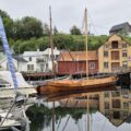 Kirkebåten «Hjelmkonnå» legger til ved Halsanaustan.