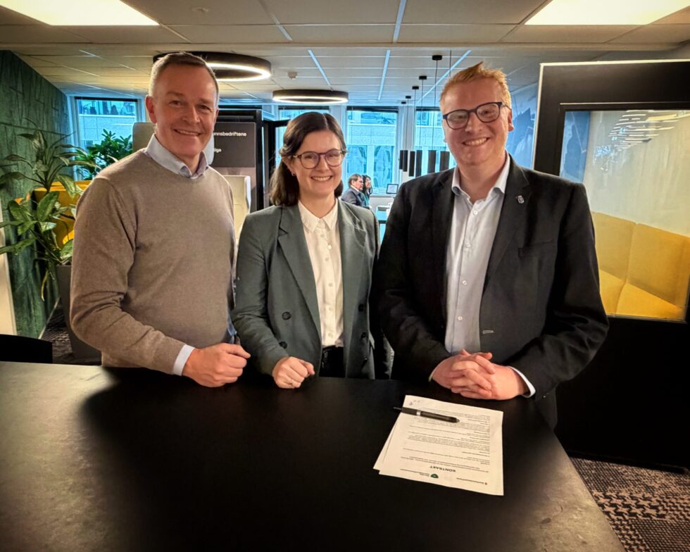 Administrerende direktør Øivind Brevik i Samfunnsbedriftene, daglig leder Tina Melfjord-Piontek og styreleder Fredrik Holm i i Norske kjernekraftkommuner (NKK). Foto: Steinar Q Andersen Samfunnsbedriftene